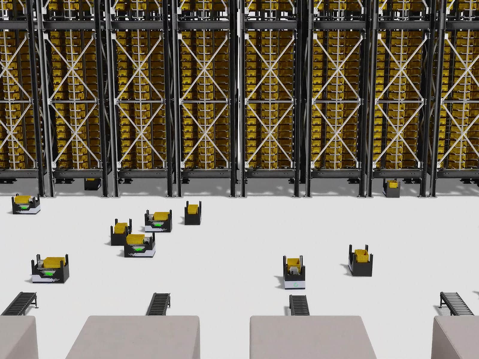 Throughput grows by adding autonomous units operating simultaneously within the grid. No centralized cranes. No structural duplication. Performance scales linearly across the architecture. The classical single-point-of-failures is omitted.